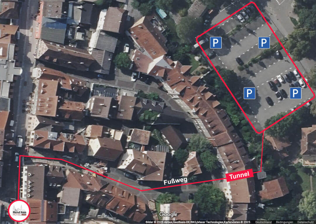 Auf der Karte finden Sie eine Beschreibung von der Seedamm-Parkanlage zum Hotel zu Fuß. Dazu durchlaufen Sie den kleinen Tunnel kurz hinter dem Parkplatz. Bitte folgen Sie der Beschilderung zur Innenstadt.